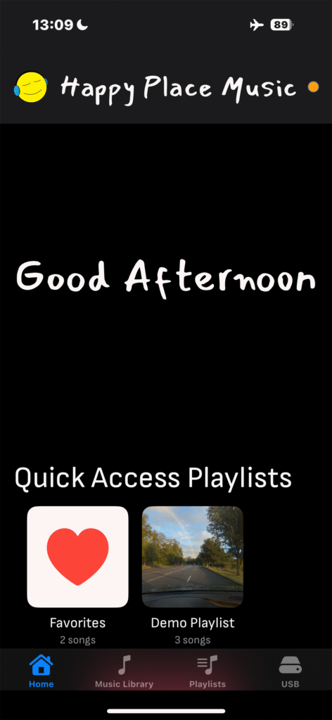 Time appropriate greeting, quick access playlists (instant playback on click), recents view, and settings. Everything you need to quickly play music.